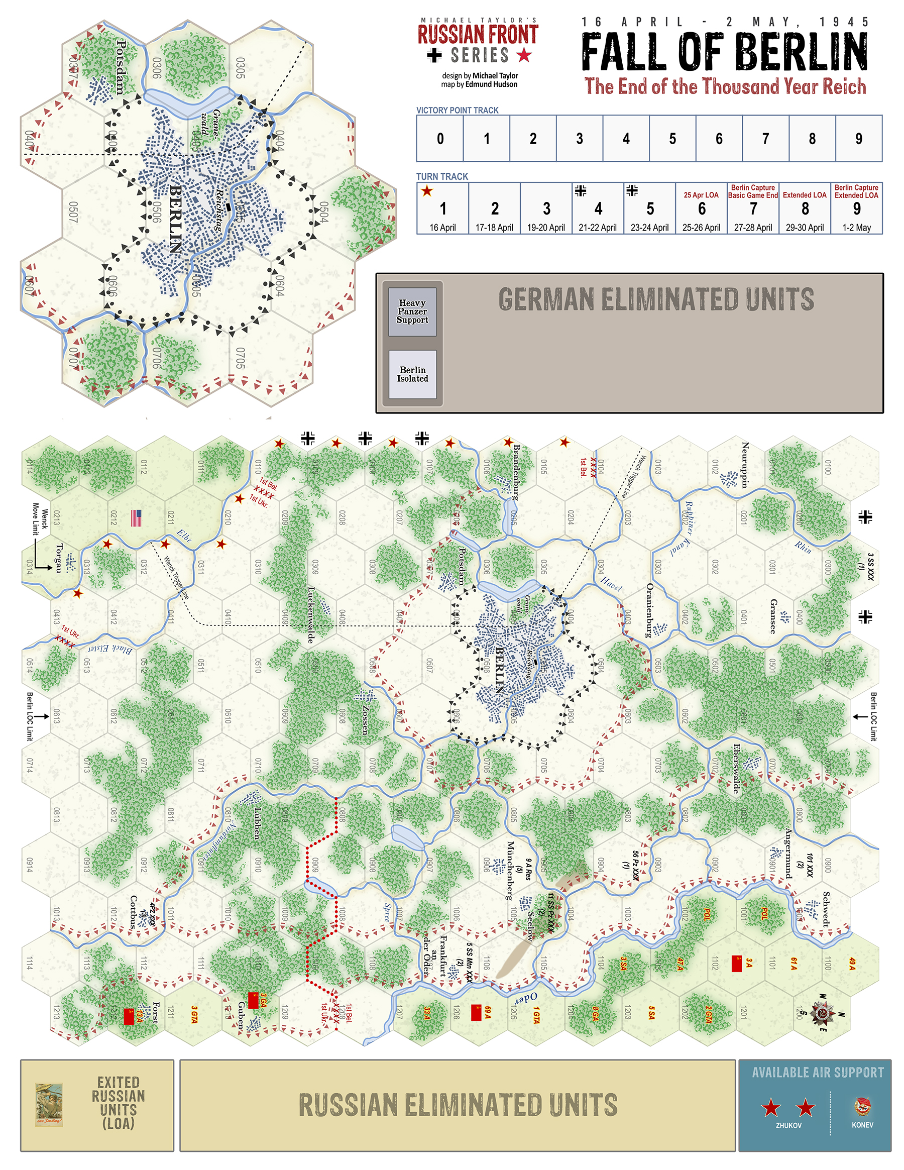 The games includes the original 11" x 17" map as well as an enlarged 17" x 22" Map which features larger hexes and a Berlin City inset map that can be used with the optional hidden force counters. |